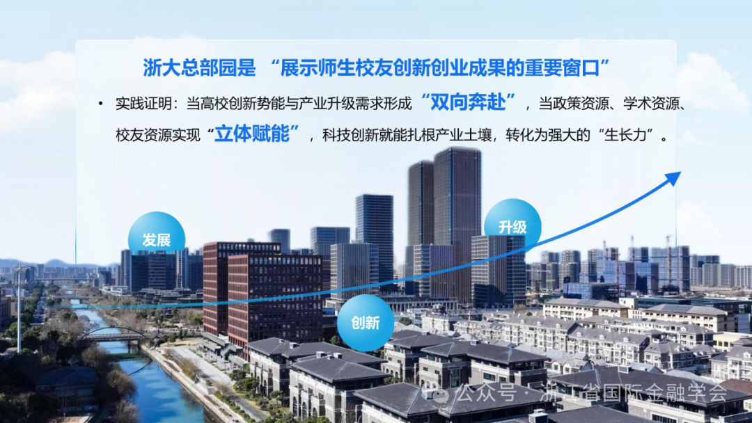 王津向卢副会长系统介绍了浙江大学创新创业研究院有限公司在构建浙大校友企业总部经济园创新赋能生态体系方面取得的最新进展。他表示,浙大双创院自2017年成立以来,始终充分依托浙江大学的学科优势、人才资源、科研实力及国际合作网络,积极建设并运营包括浙江大学校友企业总部经济园在内的一批高能级产学研协同平台,广泛汇聚全球浙大校友的创新创业力量,扎实推进科技成果转化,有效服务国家战略与区域经济发展。面向未来,他希望与浙江省国际金融学会深化合作,为进一步提升浙大双创院及校友企业总部经济园的整体创新创业能级注入新的金融活力。
