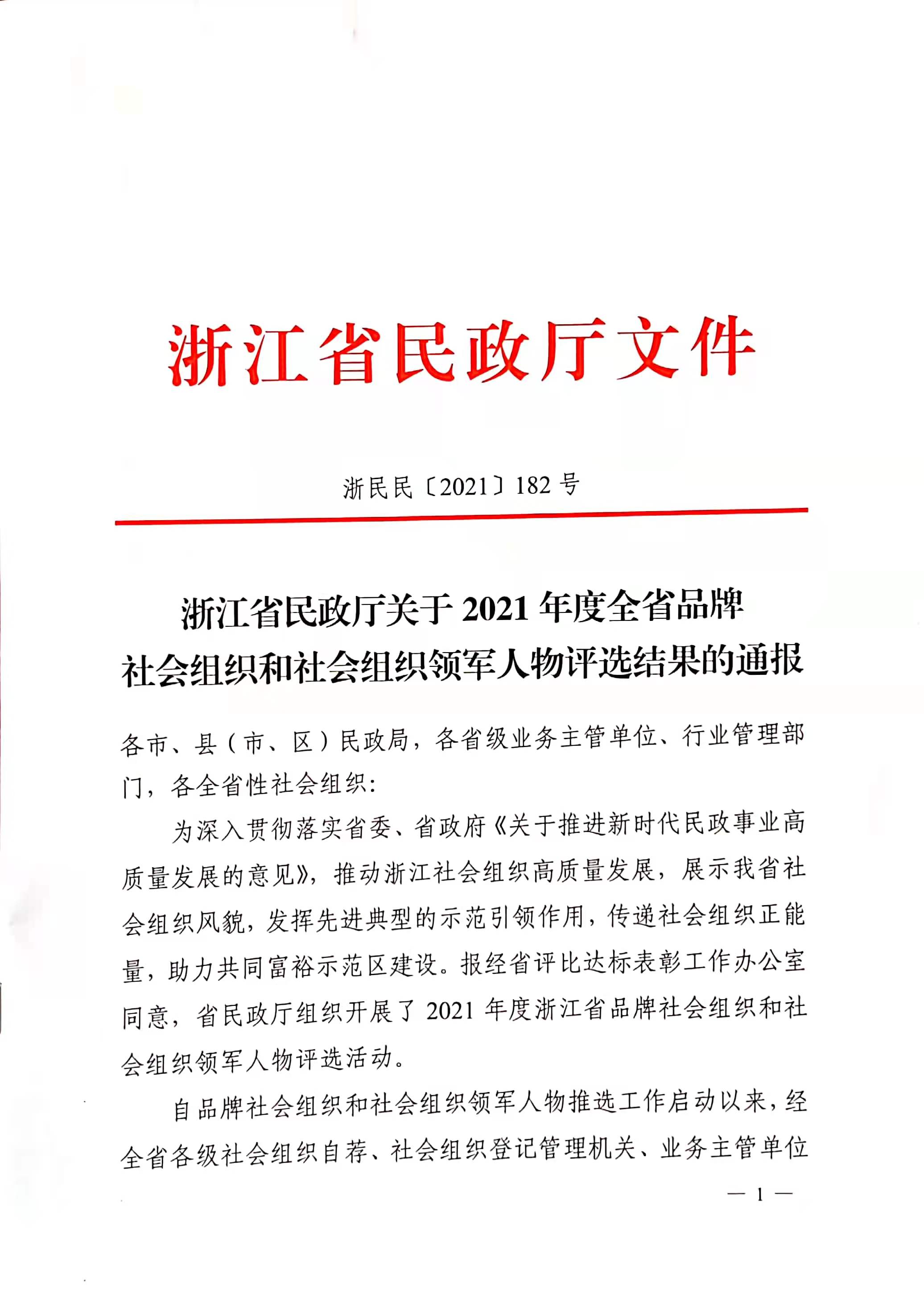 为深入贯彻落实省委、省政府《关于推进新时代民政事业高质量发展的意见》,推动浙江社会组织高质量发展,展示我省社会组织风貌,发挥先进典型的示范引领作用,传递社会组织正能量,助力共同富裕示范区建设。报经省评比达标表彰工作办公室同意,省民政厅组织开展了2021年度浙江省品牌社会组织和社会组织领军人物评选活动。