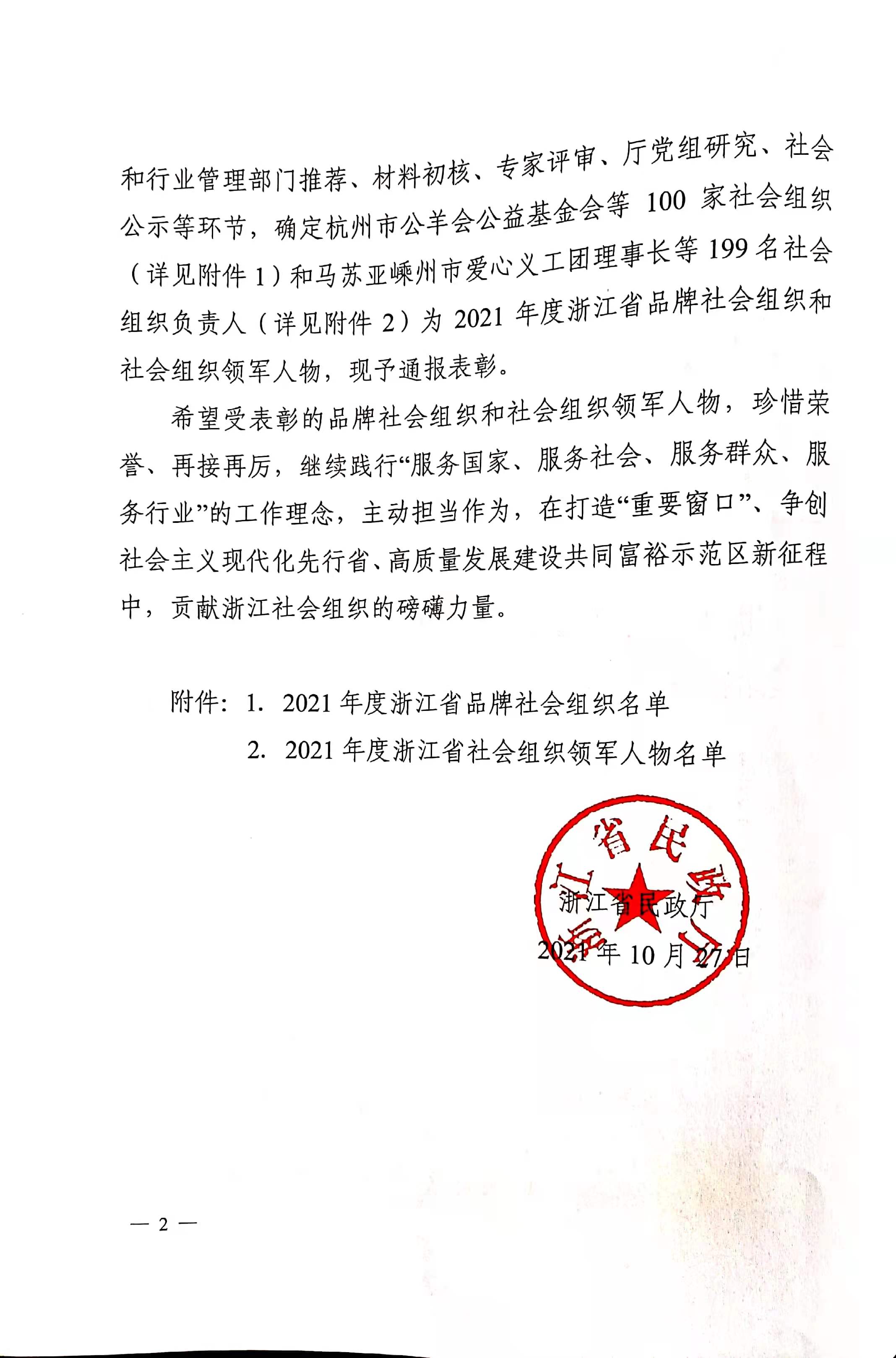 自品牌社会组织和社会组织领军人物推选工作启动以来,经全省各级社会组织自荐、社会组织登记管理机关、业务主管单位和行业管理部门推荐、材料初核、专家评审、厅党组研究、社会公示等环节,确定杭州市公羊会公益基金会等100家社会组织(详见附件1)和马苏亚嵊州市爱心义工团理事长等199名社会组织负责人(详见附件2)为2021年度浙江省品牌社会组织和社会组织领军人物,现予通报表彰。